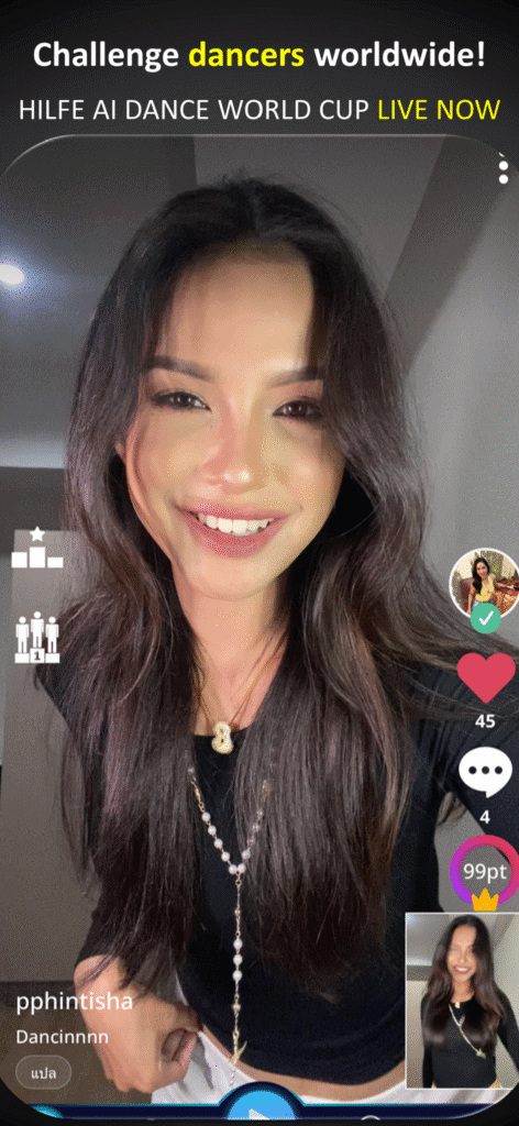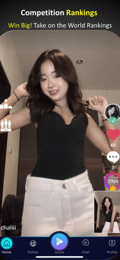The ‘Competition’ feature lets users join dance contests or take on practice challenges. Select ‘Competition’ to participate in online contests and showcase your talent, or choose ‘Challenge’ to practice and improve your skills before competing. This feature helps users enhance their abilities while connecting with others in a fun, competitive environment.
